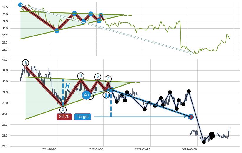 ➢ 最小中继整理跌幅→𝐇: 6.31 (低点逐步抬高斜边第一支撑点②与阻力边垂直距离)