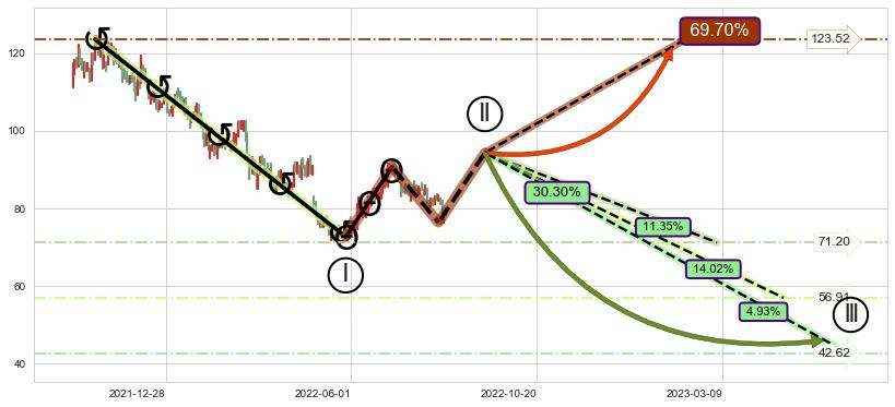 ➣ 高概率大级别循环下跌浪被破坏,反转向上(突破5浪起点)概率69.70%