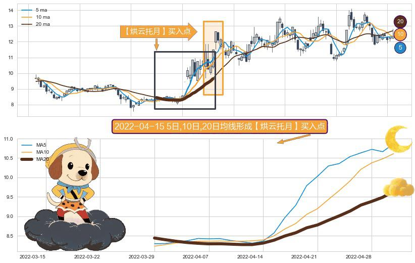形态多维评估: ⚀ 2022-03-29日-2022-05-05日显现 5日-10日-20日均线 【烘云托月】买入点 看多信号,后市看涨,买入