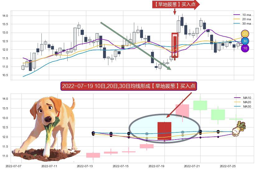 形态多维评估: ⚀ 2022-07-19日显现 10日-20日-30日均线 【旱地拔葱】买入点 看多信号,后市看涨,买入