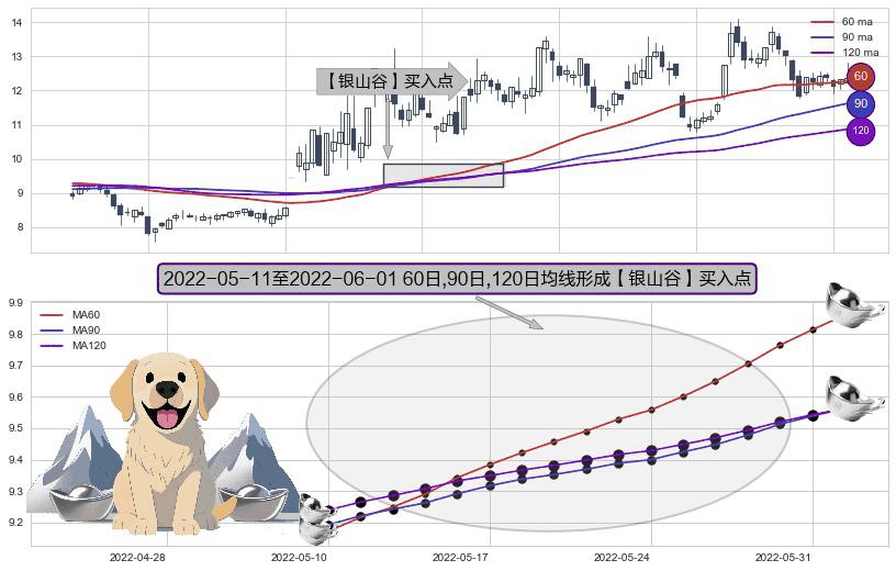 形态多维评估: ⚀ 2022-05-12-日至2022-06-01-日显现 60日-90日-120日均线 【银山谷】买入点 看多信号,后市看涨,买入