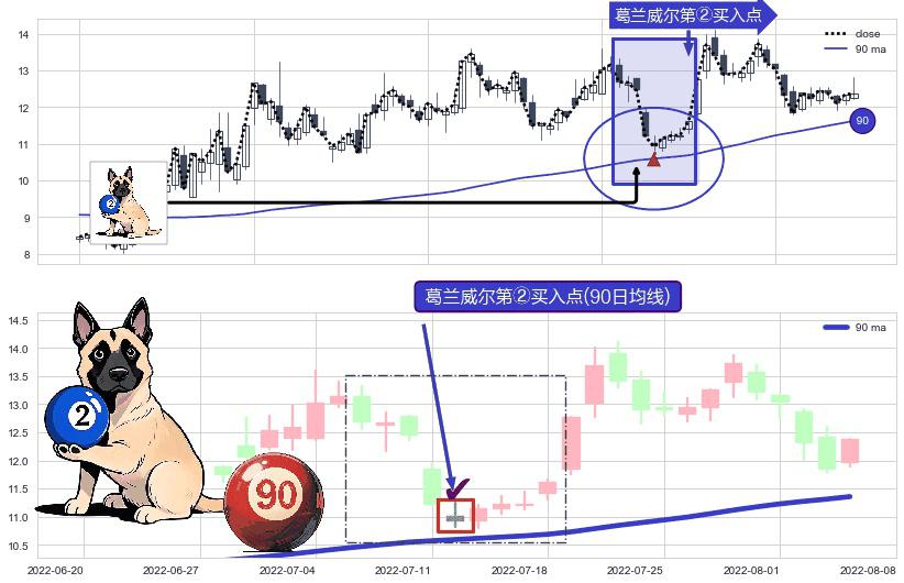 形态多维评估: ⚀ 2022-07-12-日显现 葛兰威尔均线 90日均线 第②买入点 上升趋势的中继信号,后市看涨,买进信号