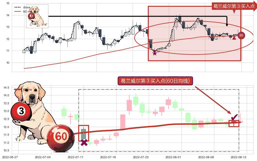 形态多维评估: ⚀ 2022-08-11-日显现 葛兰威尔均线 60日均线 第③买入点 上升趋势的中继信号,后市看涨,买进信号