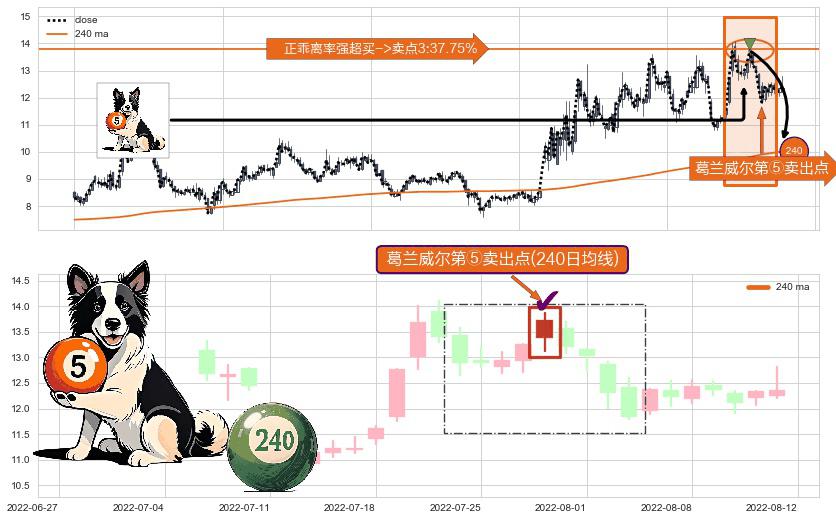 形态多维评估: ⚀ 2022-07-28-日显现 葛兰威尔均线 240日均线 第⑤卖出点 上升趋势均值回复的短线回落信号,后市看跌,卖出信号