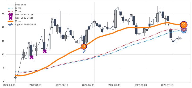 上涨趋势2022-04-13-2022-07-15,均线30确认关键支撑1处