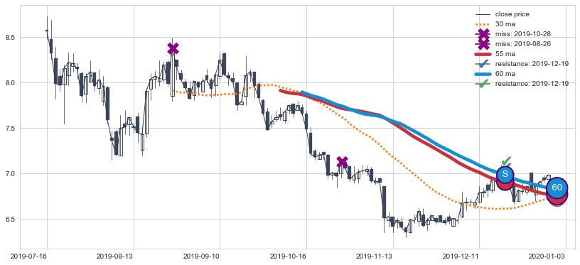 下跌趋势2019-07-16-2020-01-03,均线60, 55确认关键阻力1处