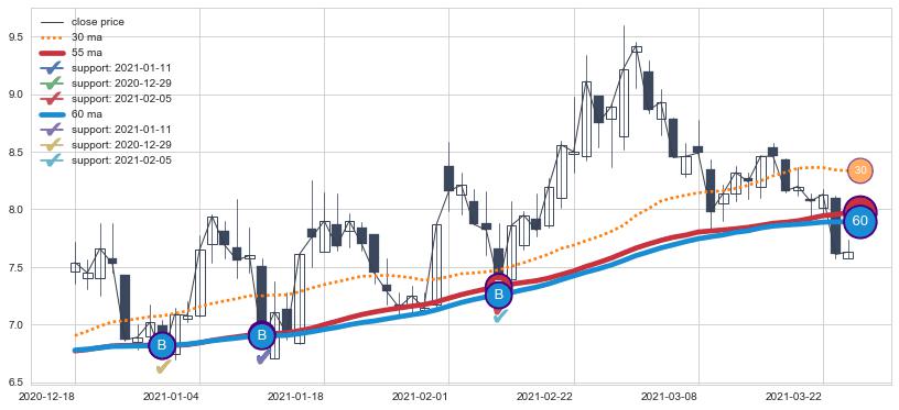 上涨趋势2020-12-18-2021-03-24,均线60, 55确认关键支撑3处