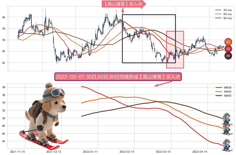 形态多维评估: ⚀ 2021-12-28日-2022-04-27日显现 30日-60日-90日均线 【高山滑雪】买入点 看多信号,后市看涨,买入