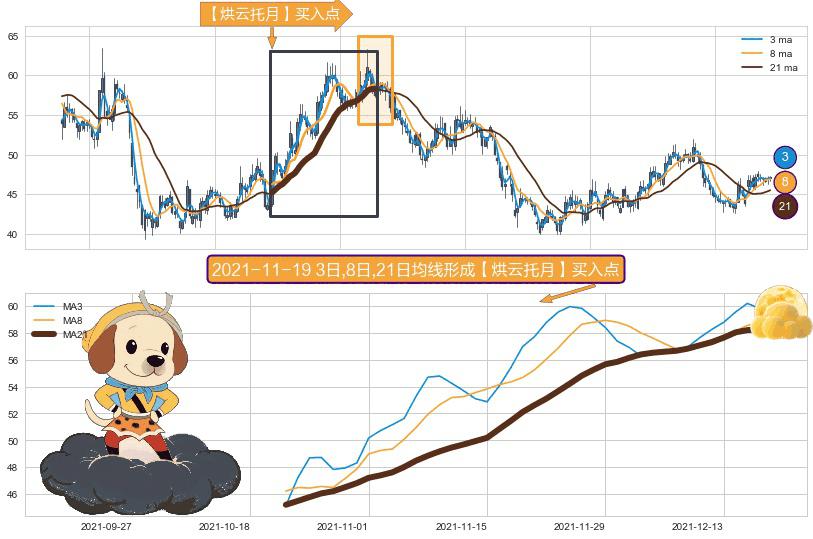 形态多维评估: ⚀ 2021-10-21日-2021-12-17日显现 3日-8日-21日均线 【烘云托月】买入点 看多信号,后市看涨,买入