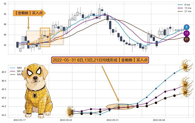 形态多维评估: ⚀ 2022-05-31日显现 8日-13日-21日均线 【金蜘蛛】买入点 看多信号,后市看涨,买入