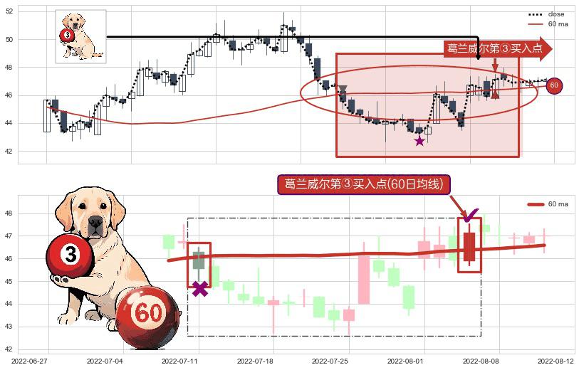 形态多维评估: ⚀ 2022-08-04-日显现 葛兰威尔均线 60日均线 第③买入点 上升趋势的中继信号,后市看涨,买进信号