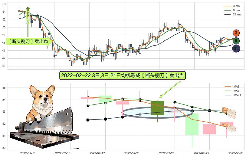 形态多维评估: ⚀ 2022-02-22日显现 3日-8日-21日均线 【断头铡刀】卖出点 看空信号,后市看跌,卖出