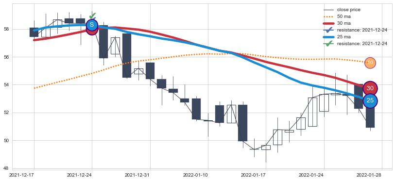 下跌趋势2021-12-17-2022-01-28,均线25, 30确认关键阻力1处