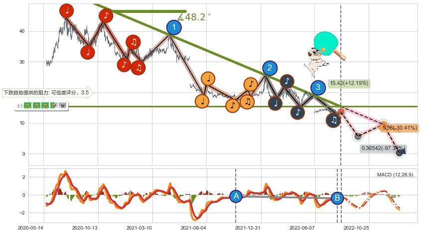 从2020-07-10至2022-08-12,共包含510个交易日,阶段股价下跌-89.83%,阶段股价变动位移路程比: 1 : 11,下跌趋势角度: 48.2,2021-06-23向↘︎形成缺口,跳空下跌-28.64%˚