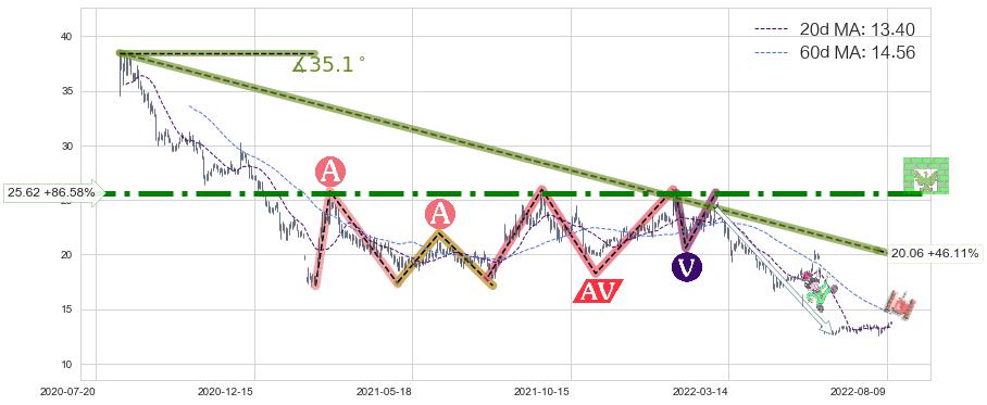 从2020-08-10至2022-08-01,共包含480个交易日,阶段股价下跌-85.72%,阶段股价变动位移路程比: 1 : 9,下跌趋势角度: 35.1,2022-06-10向↘︎形成缺口,跳空下跌-31.89%˚