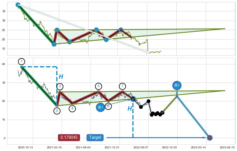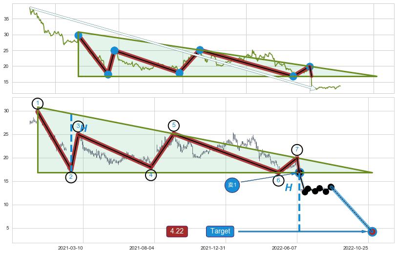 | 8 🅚:升势受阻 ➕ 📐:下降三角整理下行突破支撑位破位, 猜想持续下沉下跌,被突破的支撑位已变为阻力位 ☞ 看空信号 ⇥ 【🅚线】交织【图形】⇥ 综合量化分数: 44 | > |