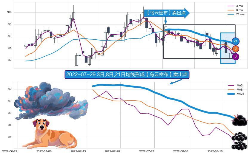 ⚀ 2022-07-14日-2022-08-12日显现 3日-8日-21日均线 【乌云密布】卖出点 看空信号,后市看跌,卖出