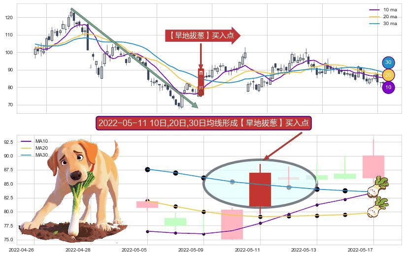 ⚀ 2022-05-11日显现 10日-20日-30日均线 【旱地拔葱】买入点 看多信号,后市看涨,买入