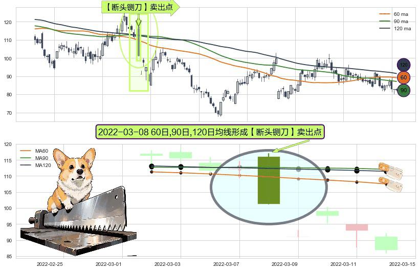 ⚀ 2022-03-08日显现 60日-90日-120日均线 【断头铡刀】卖出点 看空信号,后市看跌,卖出