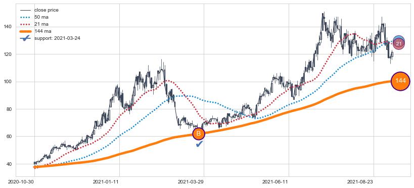 ⚁ MA3和MA8走势平行,且始终保持在短距离内,MA21始终在短中期均线上方,与短中期均线保持一定的距离,微微下行