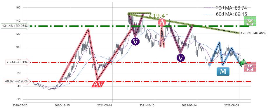 ♘ 支撑价格位76.44,可信任强度60.11%,距离最后交易2022-08-12形成的收盘价格82.20相差 -7.01%