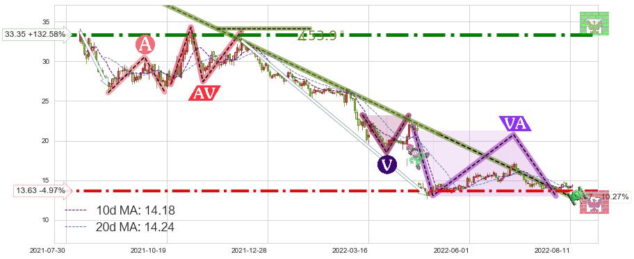 ♘ 支撑价格位13.63,可信任强度74.46%,距离最后交易2022-08-12形成的收盘价格14.34相差 -4.97%