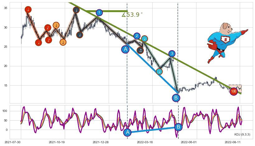 从2021-12-09至2022-08-12,共包含165个交易日,阶段股价下跌-70.56%,阶段股价变动位移路程比: 1 : 4,2022-04-22向↘︎形成缺口,跳空下跌-31.99%˚