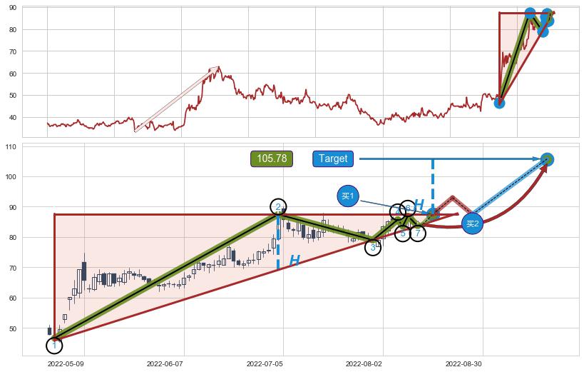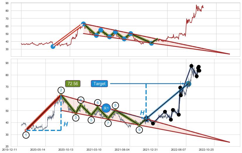 ➢ 最小中继整理涨幅→𝐇: 29.53 (𝐇楔型旗杆的长度:楔型起点→顶点)