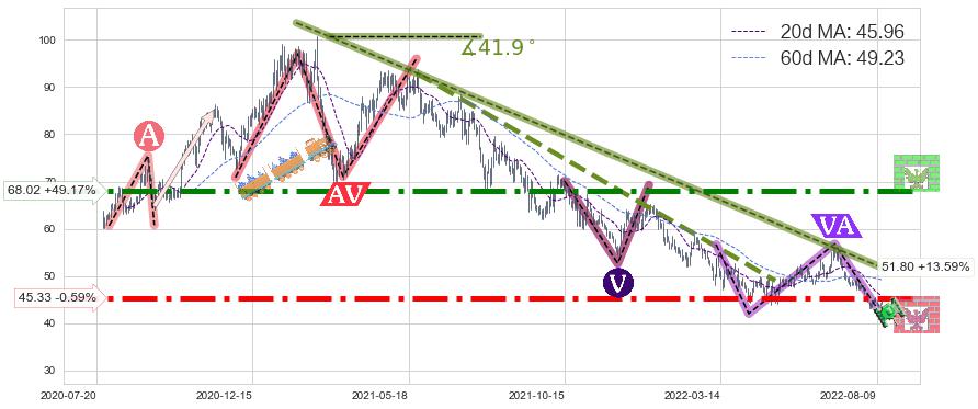 ♘ 阻力价格位68.02,可信任强度91.50%,距离最后交易2022-08-12形成的收盘价格45.60相差 +49.17%