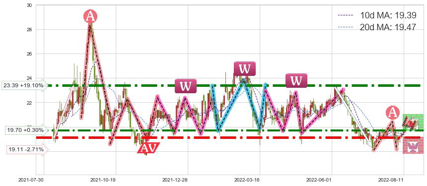 ♘ 支撑价格位19.11,可信任强度92.63%,距离最后交易2022-08-12形成的收盘价格19.64相差 -2.71%