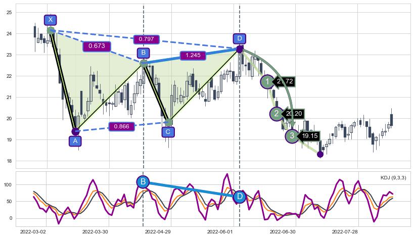 ➢ 谐波价格D点比B点高 ⤴,【KDJ】指标D点比B点低 ⤵️