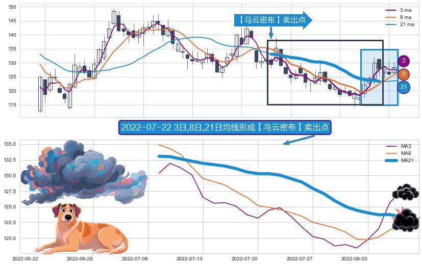 ⚀ 2022-07-07日-2022-08-08日显现 3日-8日-21日均线 【乌云密布】卖出点 看空信号,后市看跌,卖出