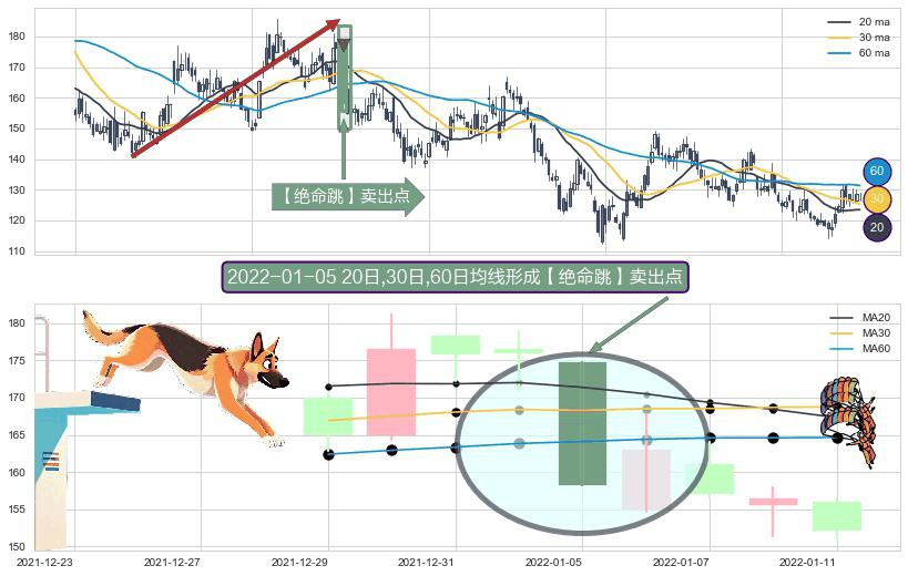 ⚀ 2022-01-05日显现 20日-30日-60日均线 【绝命跳】卖出点 看空信号,后市看跌,卖出