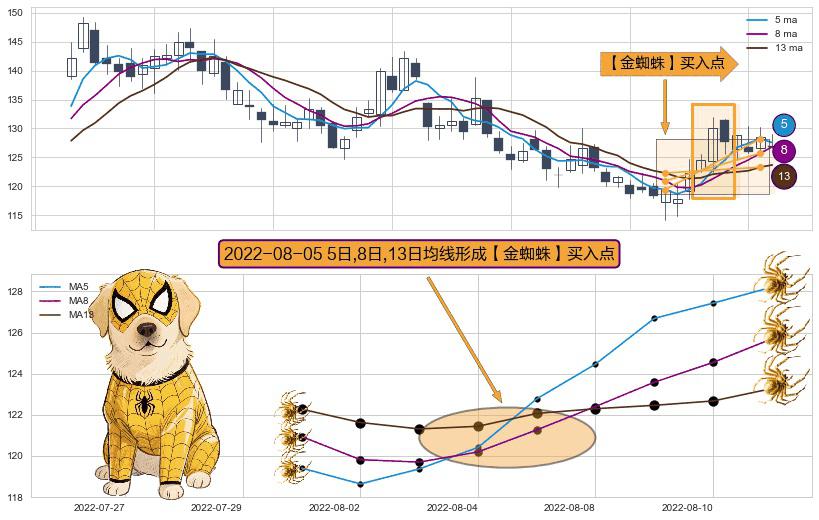 ⚀ 2022-08-05日显现 5日-8日-13日均线 【金蜘蛛】买入点 看多信号,后市看涨,买入