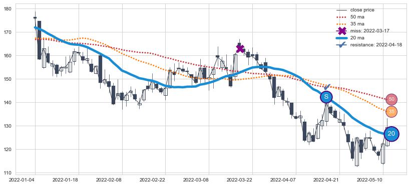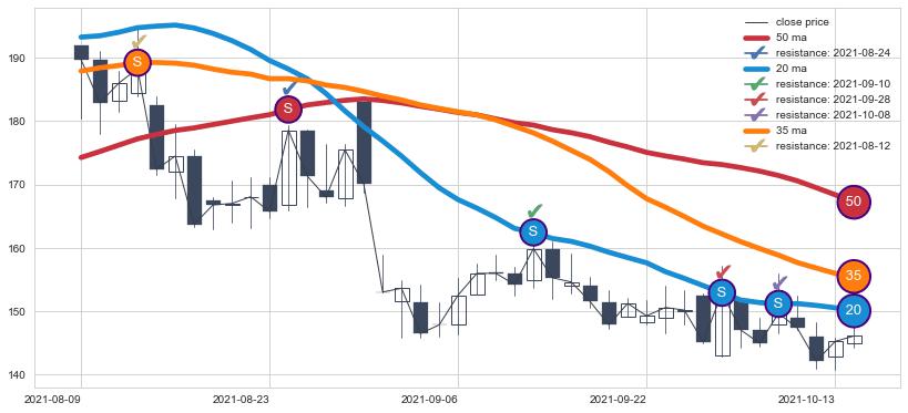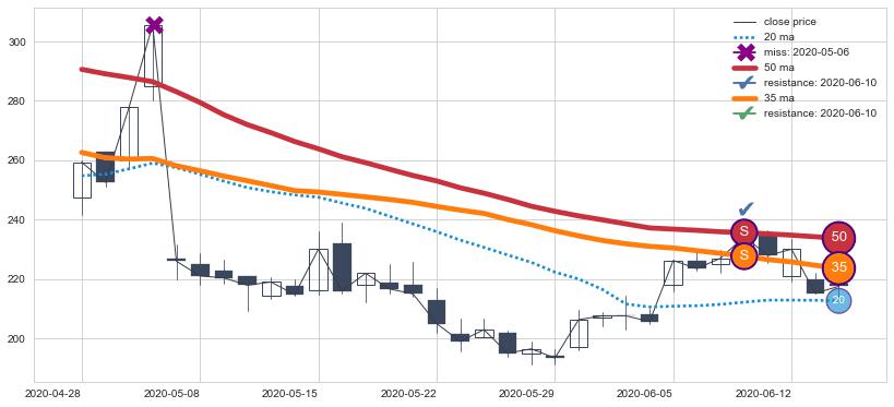 ⚄ 价格在均线遇到阻力后已再次向下回落了【较长】距离, 第⑦卖出点 阻力效果得到【初步确认】