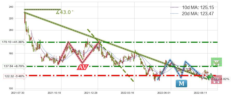 ♘ 阻力价格位137.84,可信任强度83.06%,距离最后交易2022-08-12形成的收盘价格126.70相差 +8.79%