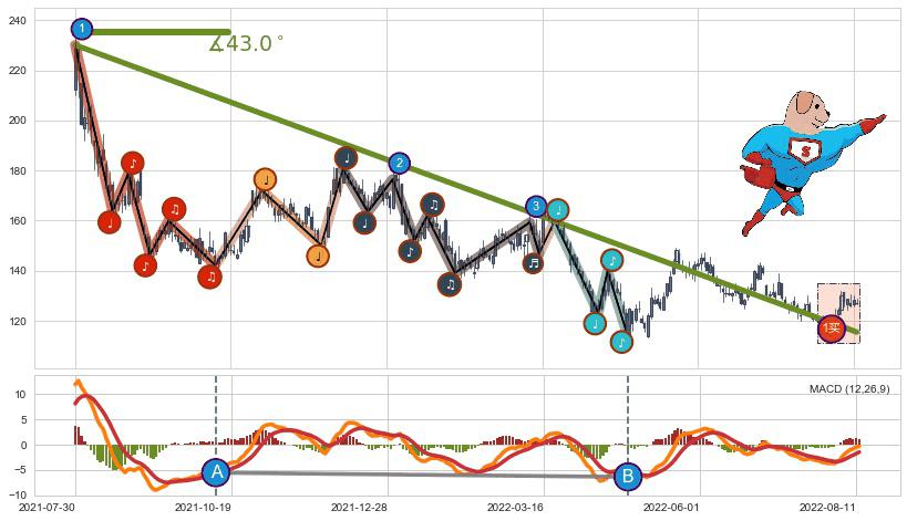 从2021-07-30至2022-05-20,共包含193个交易日,阶段股价下跌-37.22%,阶段股价变动位移路程比: 1 : 13,下跌趋势角度: 43.0