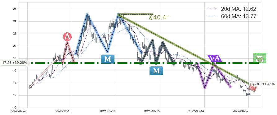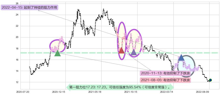 ♘ 阻力价格位17.23,可信任强度95.54%,距离最后交易2022-08-12形成的收盘价格12.37相差 +39.26%