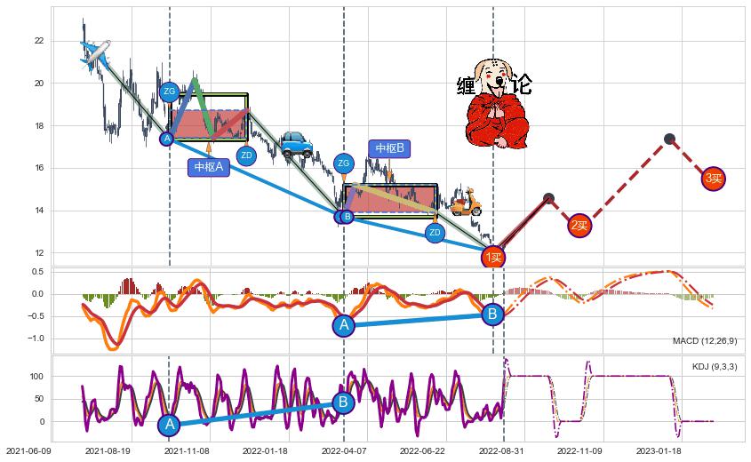 ➣ 【中枢B】:2022-03-15-2022-06-13,中枢由3笔构成,共59交易日, ZG=15.20, ZD=13.91