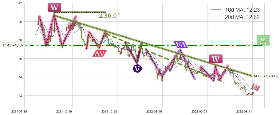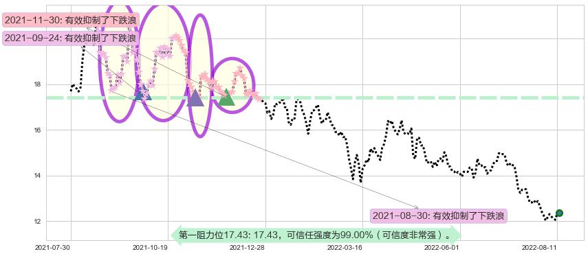 ♘ 阻力价格位17.43,可信任强度99.00%,距离最后交易2022-08-12形成的收盘价格12.37相差 +40.87%