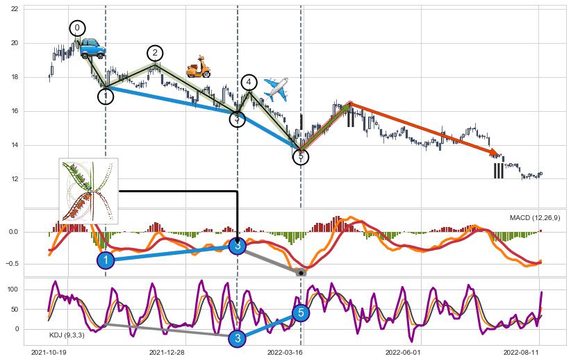 ➣ 第三,五驱动浪端点:【KDJ】走势出现【常规背离 & 反转信号】背离程度95.08%,背离夹角角度122.4˚,背离程度较大