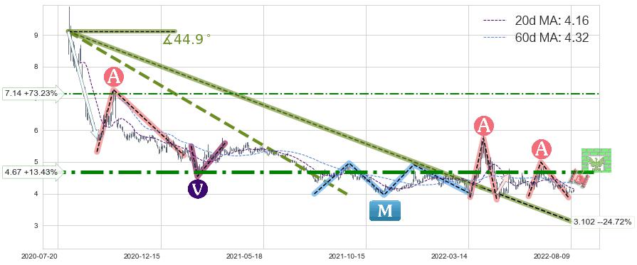 ♘ 阻力价格位4.67,可信任强度87.64%,距离最后交易2022-08-12形成的收盘价格4.12相差 +13.43%