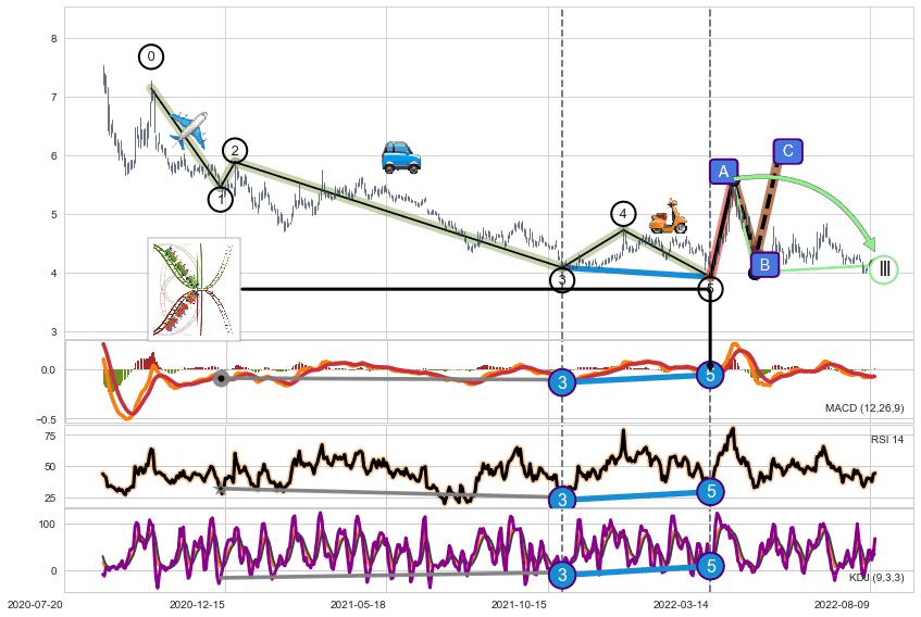 ➣ 1,3,5驱动浪MACD, RSI, KDJ走势都出现【常规背离】反转信号增强