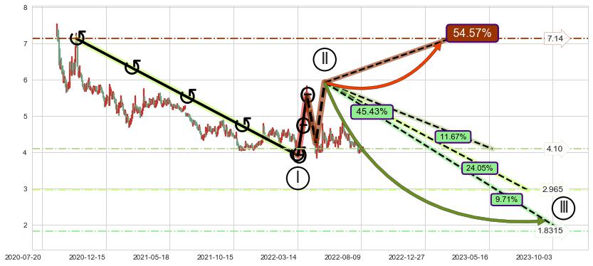 ♘ 阻力价格位7.14,可信任强度48.71%,距离最后交易2022-08-12形成的收盘价格4.12相差 +73.23%