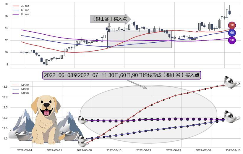 形态多维评估: ⚀ 2022-06-09-日至2022-07-11-日显现 30日-60日-90日均线 【银山谷】买入点 看多信号,后市看涨,买入