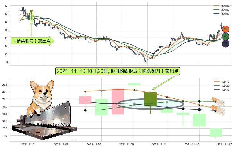 形态多维评估: ⚀ 2021-11-10日显现 10日-20日-30日均线 【断头铡刀】卖出点 看空信号,后市看跌,卖出