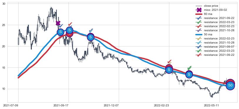 下跌趋势2021-07-09-2022-05-20,均线50, 60确认关键阻力5处