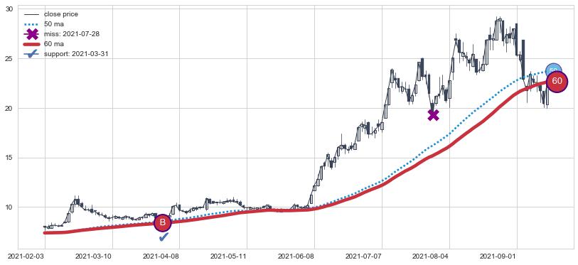上涨趋势2021-02-03-2021-09-14,均线60确认关键支撑1处
