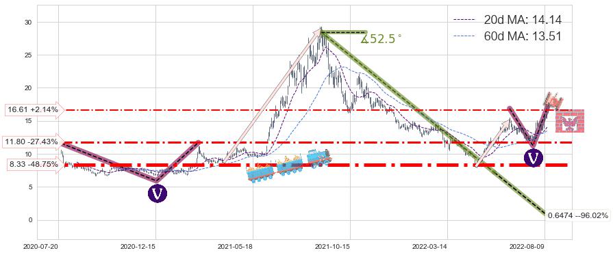 ♘ 支撑价格位11.80,可信任强度66.52%,距离最后交易2022-08-12形成的收盘价格16.26相差 -27.43%