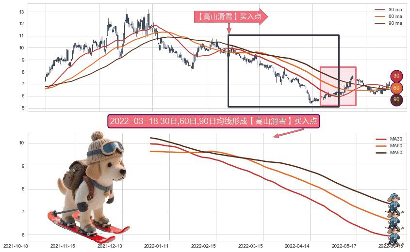⚀ 2021-12-29日-2022-06-07日显现 30日-60日-90日均线 【高山滑雪】买入点 看多信号,后市看涨,买入